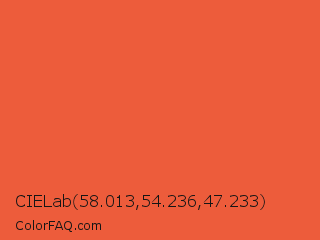 CIELab 58.013,54.236,47.233 Color is a normal red color and the nearest color is Orange Soda #fa5b3d. Hex code #ed5c3b and RGB value is rgb(237,92,59). In RGB color space, this color is composed of 93% red, 36% green, 23% blue, In CMYK color space, this color is composed of 0% cyan, 61% magenta, 75% yellow , 7% black , In HSL color space, this color has a hue angle of 11° , 83% saturation and 58% lightness.