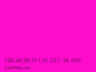 CIELab 58.017,91.237,-36.933 Color is a normal magenta color and the nearest color is Purple Pizzazz #ff00cc. Hex code #ff0cce and RGB value is rgb(255,12,206). In RGB color space, this color is composed of 100% red, 5% green, 81% blue, In CMYK color space, this color is composed of 0% cyan, 95% magenta, 19% yellow , 0% black , In HSL color space, this color has a hue angle of 312° , 100% saturation and 52% lightness.