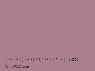 CIELab 58.024,19.961,-0.538 Color is a normal rose color and the nearest color is English Lavender #b48395. Hex code #ad7f8d and RGB value is rgb(173,127,141). In RGB color space, this color is composed of 68% red, 50% green, 55% blue, In CMYK color space, this color is composed of 0% cyan, 27% magenta, 18% yellow , 32% black , In HSL color space, this color has a hue angle of 342° , 22% saturation and 59% lightness.