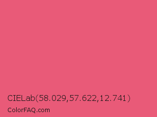 CIELab 58.029,57.622,12.741 Color is a light red color and the nearest color is Dark Pink #e75480. Hex code #e95a78 and RGB value is rgb(233,90,120). In RGB color space, this color is composed of 91% red, 35% green, 47% blue, In CMYK color space, this color is composed of 0% cyan, 61% magenta, 48% yellow , 9% black , In HSL color space, this color has a hue angle of 347° , 76% saturation and 63% lightness.