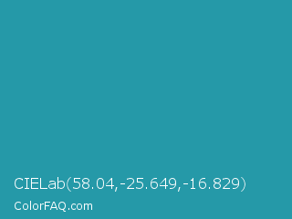 CIELab 58.04,-25.649,-16.829 Color is a normal cyan color and the nearest color is Eastern Blue #1e9ab0. Hex code #2599a8 and RGB value is rgb(37,153,168). In RGB color space, this color is composed of 15% red, 60% green, 66% blue, In CMYK color space, this color is composed of 78% cyan, 9% magenta, 0% yellow , 34% black , In HSL color space, this color has a hue angle of 187° , 64% saturation and 40% lightness.