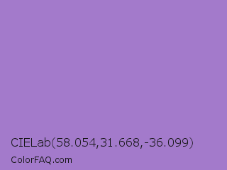 CIELab 58.054,31.668,-36.099 Color is a light violet color and the nearest color is Lilac Bush #9874d3. Hex code #a37acb and RGB value is rgb(163,122,203). In RGB color space, this color is composed of 64% red, 48% green, 80% blue, In CMYK color space, this color is composed of 20% cyan, 40% magenta, 0% yellow , 20% black , In HSL color space, this color has a hue angle of 270° , 44% saturation and 64% lightness.