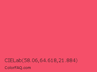 CIELab 58.06,64.618,21.884 Color is a light red color and the nearest color is Infra Red #ff496c. Hex code #f54f69 and RGB value is rgb(245,79,105). In RGB color space, this color is composed of 96% red, 31% green, 41% blue, In CMYK color space, this color is composed of 0% cyan, 68% magenta, 57% yellow , 4% black , In HSL color space, this color has a hue angle of 351° , 89% saturation and 64% lightness.