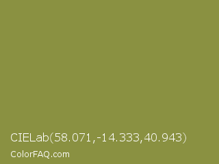 CIELab 58.071,-14.333,40.943 Color is a normal yellow color and the nearest color is Sycamore #908d39. Hex code #8a9141 and RGB value is rgb(138,145,65). In RGB color space, this color is composed of 54% red, 57% green, 25% blue, In CMYK color space, this color is composed of 5% cyan, 0% magenta, 55% yellow , 43% black , In HSL color space, this color has a hue angle of 65° , 38% saturation and 41% lightness.