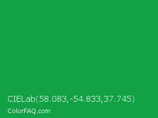 CIELab 58.083,-54.833,37.745 Color is a normal green color and the nearest color is Green Pigment #00a550. Hex code #12a145 and RGB value is rgb(18,161,69). In RGB color space, this color is composed of 7% red, 63% green, 27% blue, In CMYK color space, this color is composed of 89% cyan, 0% magenta, 57% yellow , 37% black , In HSL color space, this color has a hue angle of 141° , 80% saturation and 35% lightness.