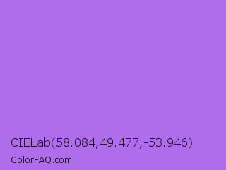 CIELab 58.084,49.477,-53.946 Color is a light purple color and the nearest color is Lavender #b57edc. Hex code #af6deb and RGB value is rgb(175,109,235). In RGB color space, this color is composed of 69% red, 43% green, 92% blue, In CMYK color space, this color is composed of 26% cyan, 54% magenta, 0% yellow , 8% black , In HSL color space, this color has a hue angle of 271° , 76% saturation and 67% lightness.