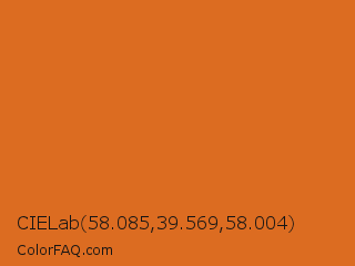 CIELab 58.085,39.569,58.004 Color is a normal orange color and the nearest color is Hot Cinnamon #d2691e. Hex code #dc6c21 and RGB value is rgb(220,108,33). In RGB color space, this color is composed of 86% red, 42% green, 13% blue, In CMYK color space, this color is composed of 0% cyan, 51% magenta, 85% yellow , 14% black , In HSL color space, this color has a hue angle of 24° , 74% saturation and 50% lightness.