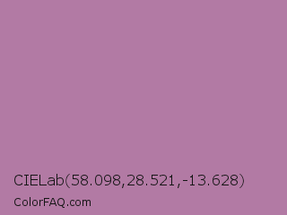 CIELab 58.098,28.521,-13.628 Color is a normal magenta color and the nearest color is Bouquet #ae809e. Hex code #b27aa4 and RGB value is rgb(178,122,164). In RGB color space, this color is composed of 70% red, 48% green, 64% blue, In CMYK color space, this color is composed of 0% cyan, 31% magenta, 8% yellow , 30% black , In HSL color space, this color has a hue angle of 315° , 27% saturation and 59% lightness.