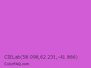 CIELab 58.098,62.231,-41.866 Color is a normal magenta color and the nearest color is Orchid #da70d6. Hex code #d15cd6 and RGB value is rgb(209,92,214). In RGB color space, this color is composed of 82% red, 36% green, 84% blue, In CMYK color space, this color is composed of 2% cyan, 57% magenta, 0% yellow , 16% black , In HSL color space, this color has a hue angle of 298° , 60% saturation and 60% lightness.