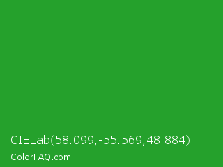CIELab 58.099,-55.569,48.884 Color is a normal green color and the nearest color is Wageningen Green #34b233. Hex code #25a12c and RGB value is rgb(37,161,44). In RGB color space, this color is composed of 15% red, 63% green, 17% blue, In CMYK color space, this color is composed of 77% cyan, 0% magenta, 73% yellow , 37% black , In HSL color space, this color has a hue angle of 123° , 63% saturation and 39% lightness.