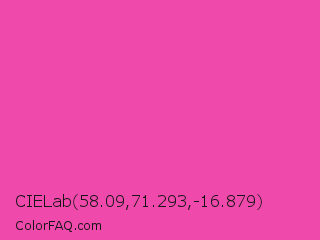 CIELab 58.09,71.293,-16.879 Color is a light magenta color and the nearest color is Brilliant Rose #f653a6. Hex code #ef49ab and RGB value is rgb(239,73,171). In RGB color space, this color is composed of 94% red, 29% green, 67% blue, In CMYK color space, this color is composed of 0% cyan, 69% magenta, 28% yellow , 6% black , In HSL color space, this color has a hue angle of 325° , 84% saturation and 61% lightness.
