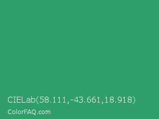 CIELab 58.111,-43.661,18.918 Color is a normal green color and the nearest color is Illuminating Emerald #319177. Hex code #2f9e69 and RGB value is rgb(47,158,105). In RGB color space, this color is composed of 18% red, 62% green, 41% blue, In CMYK color space, this color is composed of 70% cyan, 0% magenta, 34% yellow , 38% black , In HSL color space, this color has a hue angle of 151° , 54% saturation and 40% lightness.
