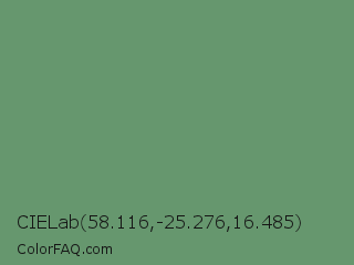 CIELab 58.116,-25.276,16.485 Color is a normal green color and the nearest color is Russian Green #679267. Hex code #66976e and RGB value is rgb(102,151,110). In RGB color space, this color is composed of 40% red, 59% green, 43% blue, In CMYK color space, this color is composed of 32% cyan, 0% magenta, 27% yellow , 41% black , In HSL color space, this color has a hue angle of 130° , 19% saturation and 50% lightness.