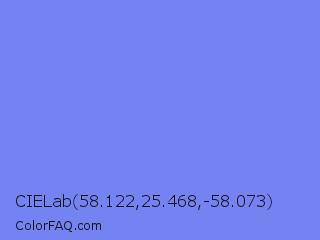 CIELab 58.122,25.468,-58.073 Color is a light blue color and the nearest color is Cornflower Blue #6495ed. Hex code #7482f2 and RGB value is rgb(116,130,242). In RGB color space, this color is composed of 45% red, 51% green, 95% blue, In CMYK color space, this color is composed of 52% cyan, 46% magenta, 0% yellow , 5% black , In HSL color space, this color has a hue angle of 233° , 83% saturation and 70% lightness.