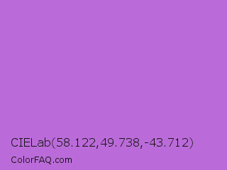 CIELab 58.122,49.738,-43.712 Color is a light purple color and the nearest color is Rich Lilac #b666d2. Hex code #bb6bd9 and RGB value is rgb(187,107,217). In RGB color space, this color is composed of 73% red, 42% green, 85% blue, In CMYK color space, this color is composed of 14% cyan, 51% magenta, 0% yellow , 15% black , In HSL color space, this color has a hue angle of 284° , 59% saturation and 64% lightness.