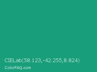CIELab 58.123,-42.255,8.824 Color is a normal cyan color and the nearest color is Green Crayola #1cac78. Hex code #199e7b and RGB value is rgb(25,158,123). In RGB color space, this color is composed of 10% red, 62% green, 48% blue, In CMYK color space, this color is composed of 84% cyan, 0% magenta, 22% yellow , 38% black , In HSL color space, this color has a hue angle of 164° , 73% saturation and 36% lightness.
