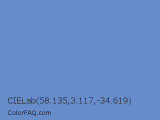 CIELab 58.135,3.117,-34.619 Color is a normal blue color and the nearest color is Blue Gray #6699cc. Hex code #678dc8 and RGB value is rgb(103,141,200). In RGB color space, this color is composed of 40% red, 55% green, 78% blue, In CMYK color space, this color is composed of 49% cyan, 30% magenta, 0% yellow , 22% black , In HSL color space, this color has a hue angle of 216° , 47% saturation and 59% lightness.