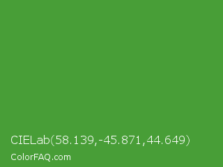 CIELab 58.139,-45.871,44.649 Color is a normal green color and the nearest color is Apple #4fa83d. Hex code #489e37 and RGB value is rgb(72,158,55). In RGB color space, this color is composed of 28% red, 62% green, 22% blue, In CMYK color space, this color is composed of 54% cyan, 0% magenta, 65% yellow , 38% black , In HSL color space, this color has a hue angle of 110° , 48% saturation and 42% lightness.