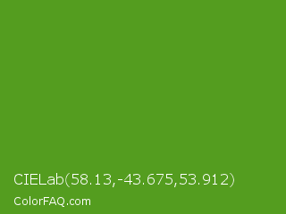 CIELab 58.13,-43.675,53.912 Color is a normal green color and the nearest color is Vida Loca #549019. Hex code #549d1f and RGB value is rgb(84,157,31). In RGB color space, this color is composed of 33% red, 62% green, 12% blue, In CMYK color space, this color is composed of 46% cyan, 0% magenta, 80% yellow , 38% black , In HSL color space, this color has a hue angle of 95° , 67% saturation and 37% lightness.