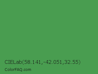 CIELab 58.141,-42.051,32.55 Color is a normal green color and the nearest color is Fruit Salad #4f9d5d. Hex code #499d50 and RGB value is rgb(73,157,80). In RGB color space, this color is composed of 29% red, 62% green, 31% blue, In CMYK color space, this color is composed of 54% cyan, 0% magenta, 49% yellow , 38% black , In HSL color space, this color has a hue angle of 125° , 37% saturation and 45% lightness.