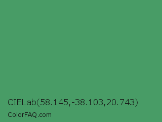 CIELab 58.145,-38.103,20.743 Color is a normal green color and the nearest color is Fruit Salad #4f9d5d. Hex code #489c66 and RGB value is rgb(72,156,102). In RGB color space, this color is composed of 28% red, 61% green, 40% blue, In CMYK color space, this color is composed of 54% cyan, 0% magenta, 35% yellow , 39% black , In HSL color space, this color has a hue angle of 141° , 37% saturation and 45% lightness.
