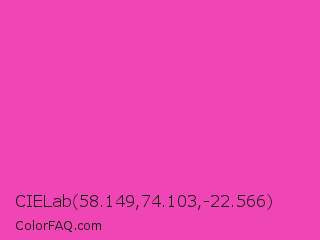 CIELab 58.149,74.103,-22.566 Color is a light magenta color and the nearest color is Brilliant Rose #f653a6. Hex code #f045b5 and RGB value is rgb(240,69,181). In RGB color space, this color is composed of 94% red, 27% green, 71% blue, In CMYK color space, this color is composed of 0% cyan, 71% magenta, 25% yellow , 6% black , In HSL color space, this color has a hue angle of 321° , 85% saturation and 61% lightness.