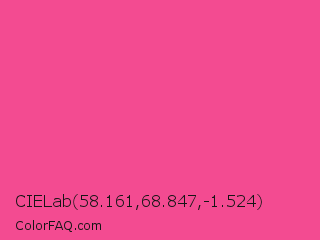 CIELab 58.161,68.847,-1.524 Color is a light rose color and the nearest color is French Rose #f64a8a. Hex code #f34b91 and RGB value is rgb(243,75,145). In RGB color space, this color is composed of 95% red, 29% green, 57% blue, In CMYK color space, this color is composed of 0% cyan, 69% magenta, 40% yellow , 5% black , In HSL color space, this color has a hue angle of 335° , 88% saturation and 62% lightness.