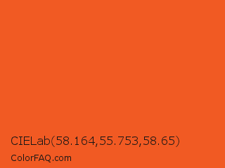 CIELab 58.164,55.753,58.65 Color is a normal orange color and the nearest color is Flamingo #f2552a. Hex code #f15a23 and RGB value is rgb(241,90,35). In RGB color space, this color is composed of 95% red, 35% green, 14% blue, In CMYK color space, this color is composed of 0% cyan, 63% magenta, 85% yellow , 5% black , In HSL color space, this color has a hue angle of 16° , 88% saturation and 54% lightness.