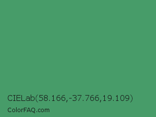 CIELab 58.166,-37.766,19.109 Color is a normal green color and the nearest color is Fruit Salad #4f9d5d. Hex code #479c69 and RGB value is rgb(71,156,105). In RGB color space, this color is composed of 28% red, 61% green, 41% blue, In CMYK color space, this color is composed of 54% cyan, 0% magenta, 33% yellow , 39% black , In HSL color space, this color has a hue angle of 144° , 37% saturation and 45% lightness.