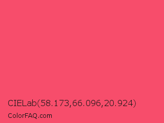 CIELab 58.173,66.096,20.924 Color is a light red color and the nearest color is Infra Red #ff496c. Hex code #f74d6b and RGB value is rgb(247,77,107). In RGB color space, this color is composed of 97% red, 30% green, 42% blue, In CMYK color space, this color is composed of 0% cyan, 69% magenta, 57% yellow , 3% black , In HSL color space, this color has a hue angle of 349° , 91% saturation and 64% lightness.