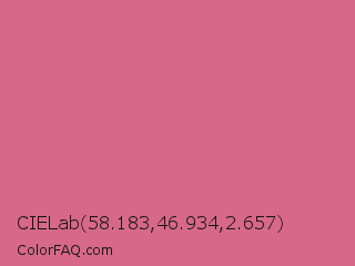 CIELab 58.183,46.934,2.657 Color is a light rose color and the nearest color is Pale Red Violet #db7093. Hex code #d76889 and RGB value is rgb(215,104,137). In RGB color space, this color is composed of 84% red, 41% green, 54% blue, In CMYK color space, this color is composed of 0% cyan, 52% magenta, 36% yellow , 16% black , In HSL color space, this color has a hue angle of 342° , 58% saturation and 63% lightness.