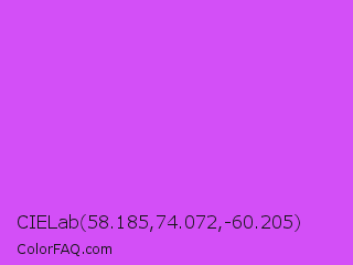 CIELab 58.185,74.072,-60.205 Color is a light purple color and the nearest color is Heliotrope #df73ff. Hex code #d34ff7 and RGB value is rgb(211,79,247). In RGB color space, this color is composed of 83% red, 31% green, 97% blue, In CMYK color space, this color is composed of 15% cyan, 68% magenta, 0% yellow , 3% black , In HSL color space, this color has a hue angle of 287° , 91% saturation and 64% lightness.