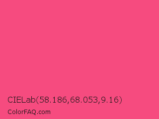 CIELab 58.186,68.053,9.16 Color is a light rose color and the nearest color is Sasquatch Socks #ff4681. Hex code #f64b7f and RGB value is rgb(246,75,127). In RGB color space, this color is composed of 96% red, 29% green, 50% blue, In CMYK color space, this color is composed of 0% cyan, 70% magenta, 48% yellow , 4% black , In HSL color space, this color has a hue angle of 342° , 90% saturation and 63% lightness.