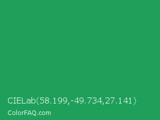 CIELab 58.199,-49.734,27.141 Color is a normal green color and the nearest color is Eucalyptus #278a5b. Hex code #1fa05a and RGB value is rgb(31,160,90). In RGB color space, this color is composed of 12% red, 63% green, 35% blue, In CMYK color space, this color is composed of 81% cyan, 0% magenta, 44% yellow , 37% black , In HSL color space, this color has a hue angle of 147° , 68% saturation and 37% lightness.