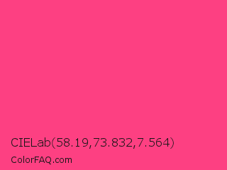 CIELab 58.19,73.832,7.564 Color is a light rose color and the nearest color is Sasquatch Socks #ff4681. Hex code #fd4082 and RGB value is rgb(253,64,130). In RGB color space, this color is composed of 99% red, 25% green, 51% blue, In CMYK color space, this color is composed of 0% cyan, 75% magenta, 49% yellow , 1% black , In HSL color space, this color has a hue angle of 339° , 98% saturation and 62% lightness.