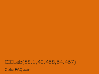 CIELab 58.1,40.468,64.467 Color is a normal orange color and the nearest color is Bamboo #da6304. Hex code #de6b0a and RGB value is rgb(222,107,10). In RGB color space, this color is composed of 87% red, 42% green, 4% blue, In CMYK color space, this color is composed of 0% cyan, 52% magenta, 95% yellow , 13% black , In HSL color space, this color has a hue angle of 27° , 91% saturation and 45% lightness.