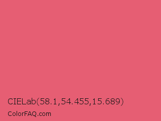 CIELab 58.1,54.455,15.689 Color is a light red color and the nearest color is Light Carmine Pink #e66771. Hex code #e65e73 and RGB value is rgb(230,94,115). In RGB color space, this color is composed of 90% red, 37% green, 45% blue, In CMYK color space, this color is composed of 0% cyan, 59% magenta, 50% yellow , 10% black , In HSL color space, this color has a hue angle of 351° , 73% saturation and 64% lightness.