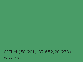 CIELab 58.201,-37.652,20.273 Color is a normal green color and the nearest color is Fruit Salad #4f9d5d. Hex code #499c67 and RGB value is rgb(73,156,103). In RGB color space, this color is composed of 29% red, 61% green, 40% blue, In CMYK color space, this color is composed of 53% cyan, 0% magenta, 34% yellow , 39% black , In HSL color space, this color has a hue angle of 142° , 36% saturation and 45% lightness.