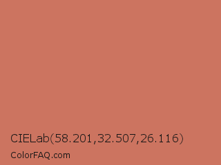 CIELab 58.201,32.507,26.116 Color is a normal red color and the nearest color is Contessa #c6726b. Hex code #cc7460 and RGB value is rgb(204,116,96). In RGB color space, this color is composed of 80% red, 45% green, 38% blue, In CMYK color space, this color is composed of 0% cyan, 43% magenta, 53% yellow , 20% black , In HSL color space, this color has a hue angle of 11° , 51% saturation and 59% lightness.