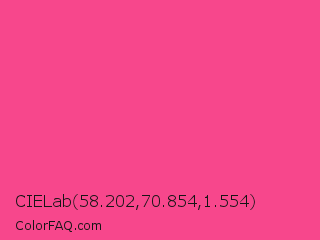 CIELab 58.202,70.854,1.554 Color is a light rose color and the nearest color is Violet Red #f7468a. Hex code #f7478c and RGB value is rgb(247,71,140). In RGB color space, this color is composed of 97% red, 28% green, 55% blue, In CMYK color space, this color is composed of 0% cyan, 71% magenta, 43% yellow , 3% black , In HSL color space, this color has a hue angle of 336° , 92% saturation and 62% lightness.