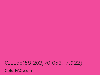 CIELab 58.203,70.053,-7.922 Color is a light rose color and the nearest color is Rose Bonbon #f9429e. Hex code #f24a9c and RGB value is rgb(242,74,156). In RGB color space, this color is composed of 95% red, 29% green, 61% blue, In CMYK color space, this color is composed of 0% cyan, 69% magenta, 36% yellow , 5% black , In HSL color space, this color has a hue angle of 331° , 87% saturation and 62% lightness.