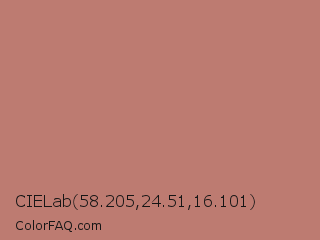 CIELab 58.205,24.51,16.101 Color is a normal red color and the nearest color is Contessa #c6726b. Hex code #bd7b71 and RGB value is rgb(189,123,113). In RGB color space, this color is composed of 74% red, 48% green, 44% blue, In CMYK color space, this color is composed of 0% cyan, 35% magenta, 40% yellow , 26% black , In HSL color space, this color has a hue angle of 8° , 37% saturation and 59% lightness.
