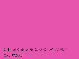 CIELab 58.208,65.001,-17.993 Color is a light magenta color and the nearest color is Brilliant Rose #f653a6. Hex code #e654ad and RGB value is rgb(230,84,173). In RGB color space, this color is composed of 90% red, 33% green, 68% blue, In CMYK color space, this color is composed of 0% cyan, 63% magenta, 25% yellow , 10% black , In HSL color space, this color has a hue angle of 323° , 74% saturation and 62% lightness.