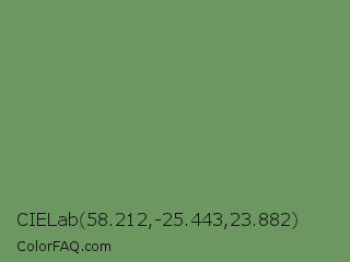 CIELab 58.212,-25.443,23.882 Color is a normal green color and the nearest color is Russian Green #679267. Hex code #6c9761 and RGB value is rgb(108,151,97). In RGB color space, this color is composed of 42% red, 59% green, 38% blue, In CMYK color space, this color is composed of 28% cyan, 0% magenta, 36% yellow , 41% black , In HSL color space, this color has a hue angle of 108° , 22% saturation and 49% lightness.