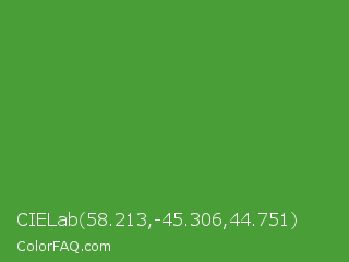 CIELab 58.213,-45.306,44.751 Color is a normal green color and the nearest color is Apple #4fa83d. Hex code #4a9e37 and RGB value is rgb(74,158,55). In RGB color space, this color is composed of 29% red, 62% green, 22% blue, In CMYK color space, this color is composed of 53% cyan, 0% magenta, 65% yellow , 38% black , In HSL color space, this color has a hue angle of 109° , 48% saturation and 42% lightness.