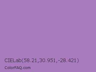 CIELab 58.21,30.951,-28.421 Color is a light purple color and the nearest color is African Violet #b284be. Hex code #aa7abe and RGB value is rgb(170,122,190). In RGB color space, this color is composed of 67% red, 48% green, 75% blue, In CMYK color space, this color is composed of 11% cyan, 36% magenta, 0% yellow , 25% black , In HSL color space, this color has a hue angle of 282° , 34% saturation and 61% lightness.