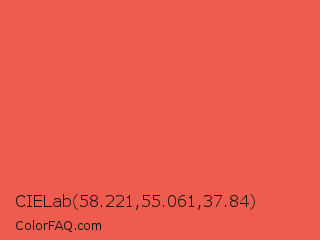 CIELab 58.221,55.061,37.84 Color is a light red color and the nearest color is Sunset Orange #fd5e53. Hex code #ed5c4d and RGB value is rgb(237,92,77). In RGB color space, this color is composed of 93% red, 36% green, 30% blue, In CMYK color space, this color is composed of 0% cyan, 61% magenta, 68% yellow , 7% black , In HSL color space, this color has a hue angle of 6° , 82% saturation and 62% lightness.