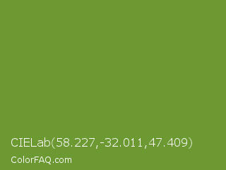 CIELab 58.227,-32.011,47.409 Color is a normal green color and the nearest color is Palm Leaf #6f9940. Hex code #6c9932 and RGB value is rgb(108,153,50). In RGB color space, this color is composed of 42% red, 60% green, 20% blue, In CMYK color space, this color is composed of 29% cyan, 0% magenta, 67% yellow , 40% black , In HSL color space, this color has a hue angle of 86° , 51% saturation and 40% lightness.
