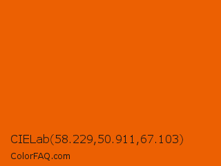 CIELab 58.229,50.911,67.103 Color is a normal orange color and the nearest color is Spanish Orange #e86100. Hex code #ec6002 and RGB value is rgb(236,96,2). In RGB color space, this color is composed of 93% red, 38% green, 1% blue, In CMYK color space, this color is composed of 0% cyan, 59% magenta, 99% yellow , 7% black , In HSL color space, this color has a hue angle of 24° , 98% saturation and 47% lightness.