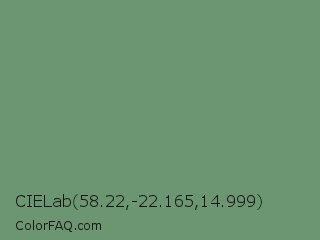 CIELab 58.22,-22.165,14.999 Color is a normal green color and the nearest color is Laurel #749378. Hex code #6c9671 and RGB value is rgb(108,150,113). In RGB color space, this color is composed of 42% red, 59% green, 44% blue, In CMYK color space, this color is composed of 28% cyan, 0% magenta, 25% yellow , 41% black , In HSL color space, this color has a hue angle of 127° , 17% saturation and 51% lightness.